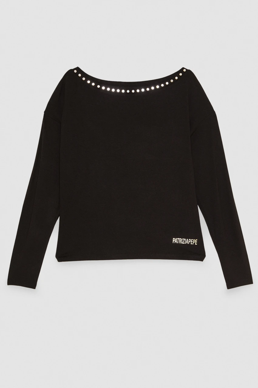 Dai un tocco di stile ai tuoi look quotidiani con questa maglia a maniche lunghe in jersey. Il capo è caratterizzato dall’applicazione di specchietti che danno luce alla scollatura.